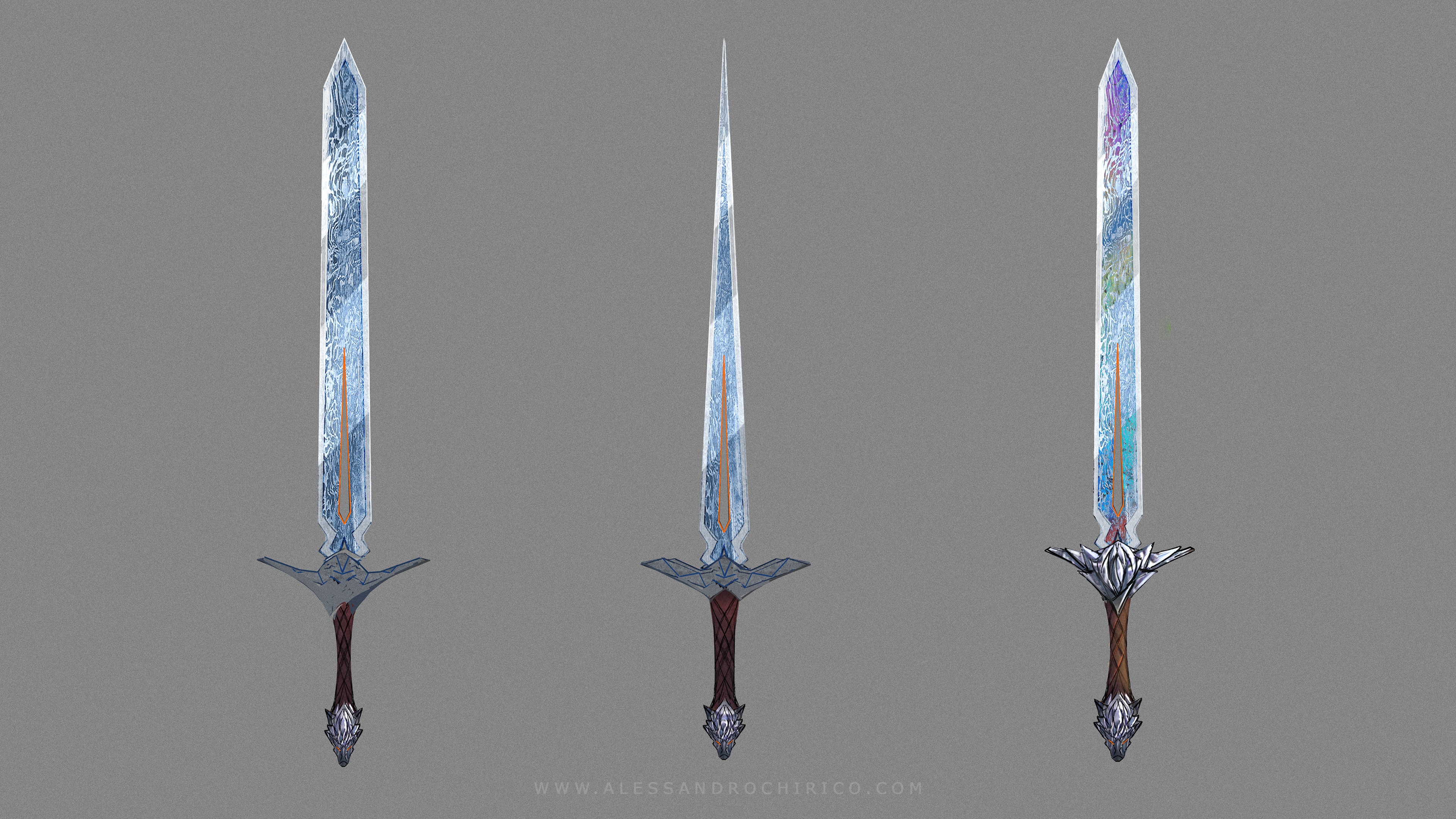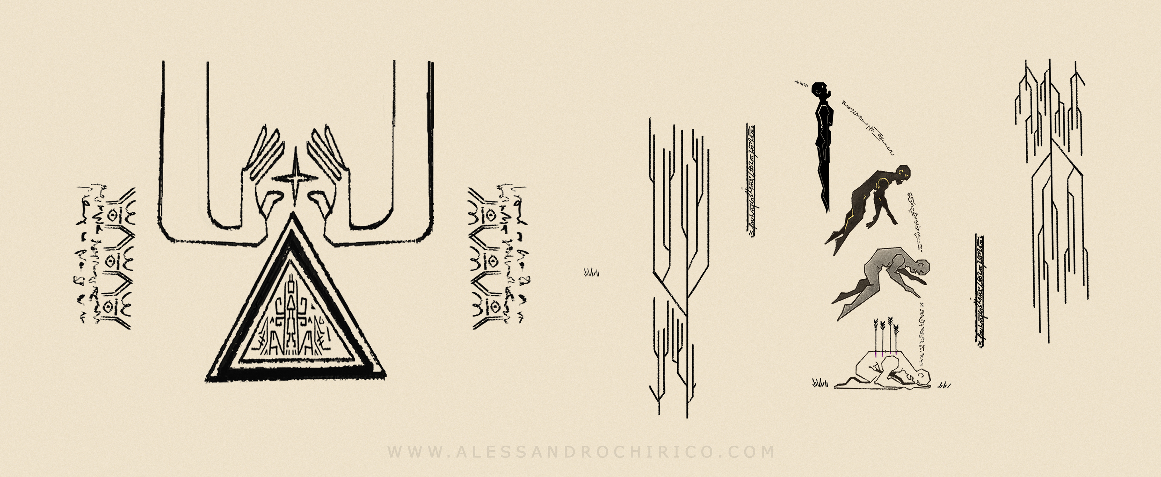 These are very initial sketches of the Wolfshead sword Drew uses in the series. I went a bit crazy with the Damascus steel engravings... It turned out the sword had to look a bit more regular as you can see in the show.
