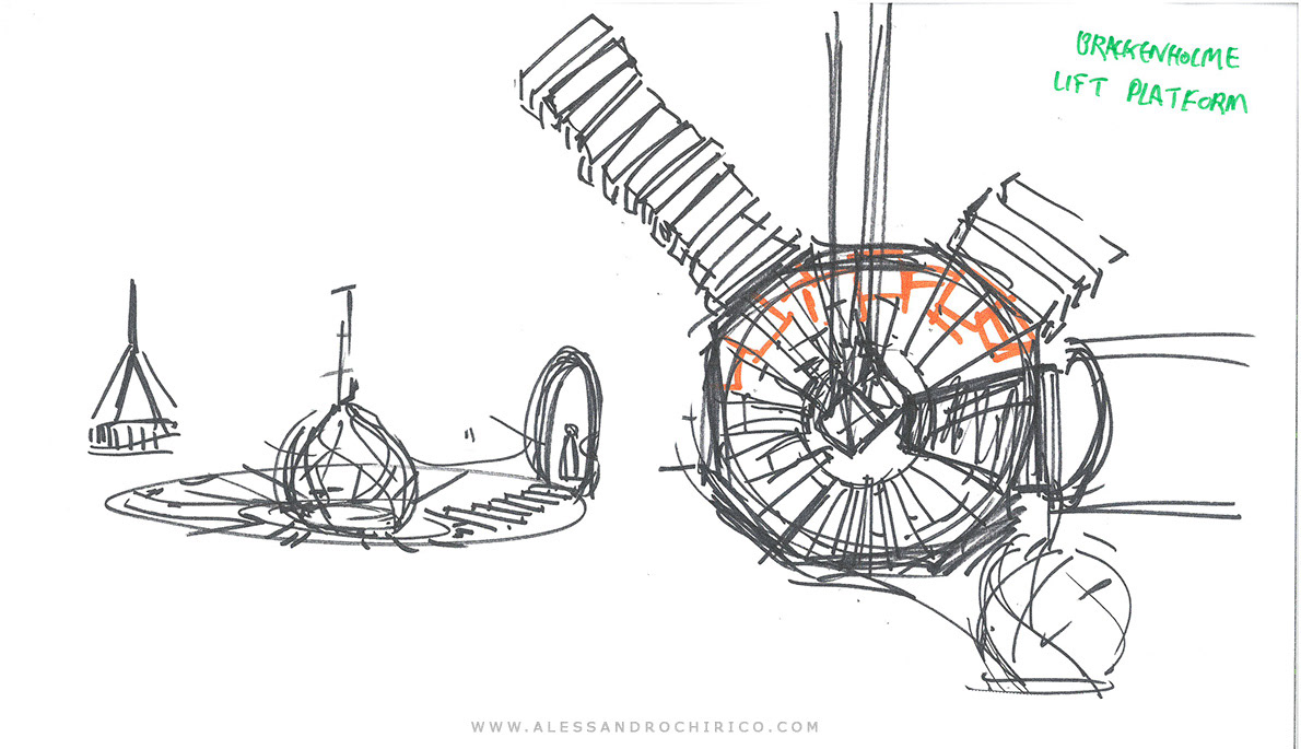 Super quick sketch done while chatting to the director Tom Brass about the look and the functionality of the lifts.